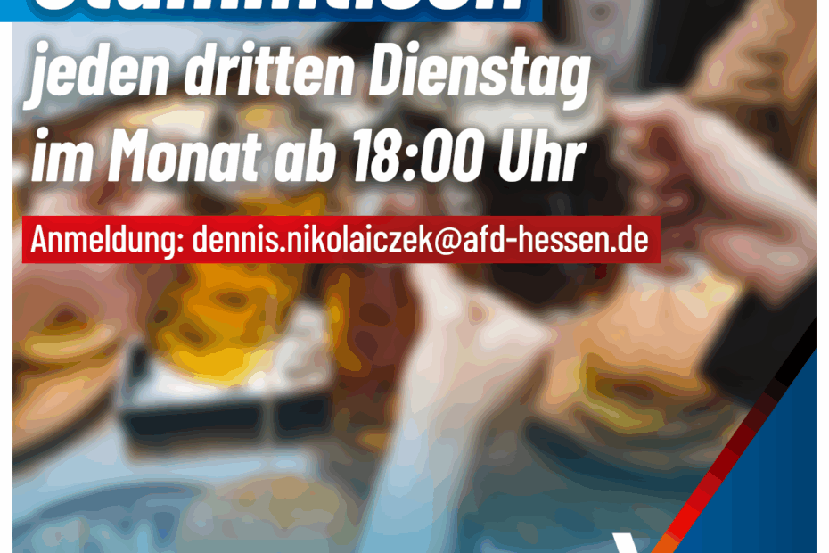 Jeden dritten Dienstag findet der Stammtisch der AfD Ortsverband Nordwaldeck statt. Nach Anmeldung (dennis.nikolaiczek@afd-hessen.de) erhalten Sie weitere Informationen.